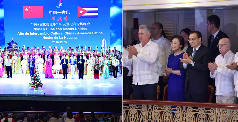 图为李克强与古巴领导人出席中古“手拉手·中拉文化交流年”活动