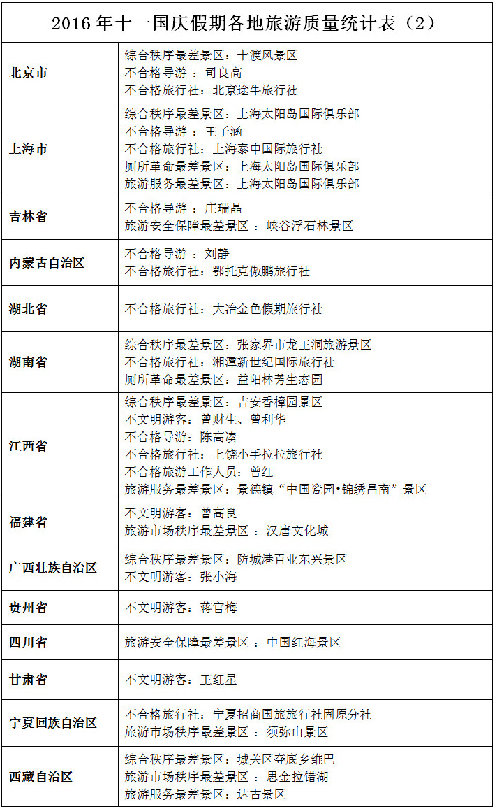 新华网北京10月9日电(记者 薛枫)国家旅游局9日发布“十一”假日旅游“红黑榜”,集中表扬一批最佳景区、优秀旅行社、优秀导游、优秀旅游工作人员和文明游客,同时也对假日期间环境脏乱、管理混乱、服务恶劣、厕所革命滞后的旅游经营单位和从业人员以及不文明游客进行了曝光。