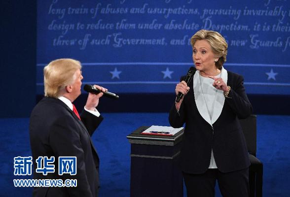 10月9日,在美国密苏里州圣路易斯市的华盛顿大学,美国共和党总统候选人唐纳德·特朗普(左)和美国民主党总统候选人希拉里·克林顿参加2016年美国总统候选人第二场电视辩论。新华社记者殷博古摄
