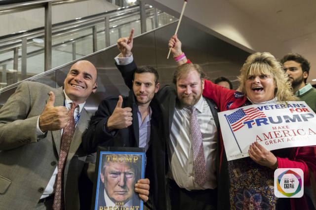 11月9日,在美国纽约希尔顿酒店,唐纳德·特朗普的支持者庆祝特朗普赢得总统选举。新华社记者李木子摄