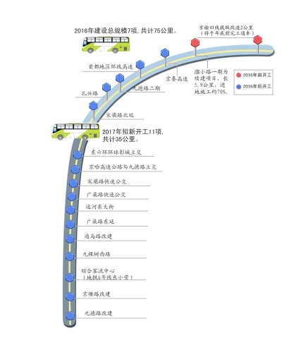 2017年拟新开工11项,共计35公里,包括东六环环球影城立交、京哈高速公路与九德路立交、宋梁路和广渠路快速公交、运河东大街、广渠路东延、通马路改建、九棵树西路、综合客流中心(地铁6号线东小营)、京塘路改建、九德路改建等。