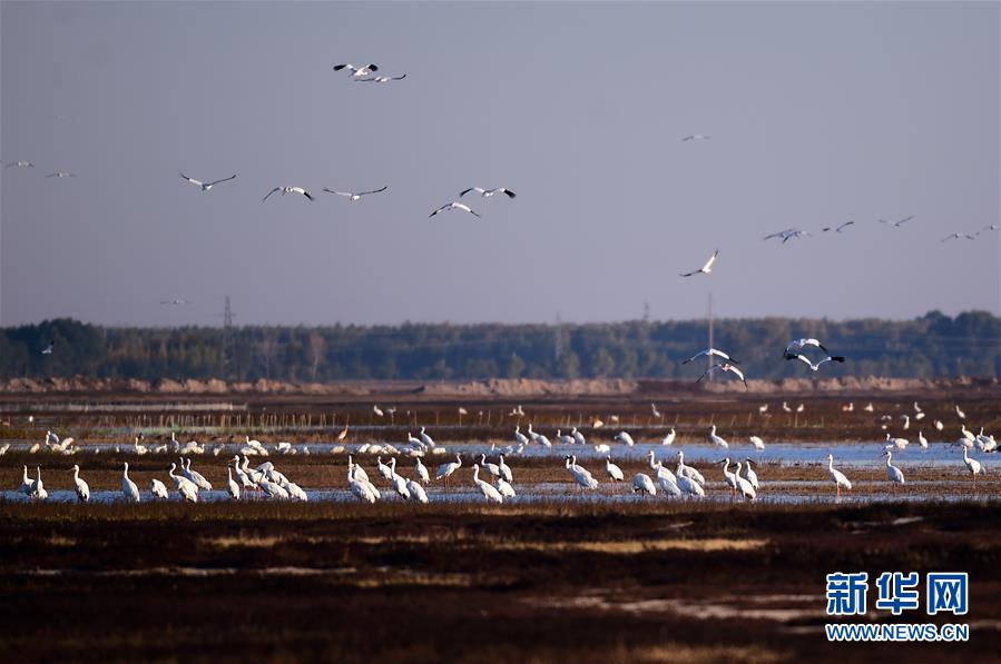10月10日,白鹤在莫莫格国家级自然保护区湿地内停歇觅食。