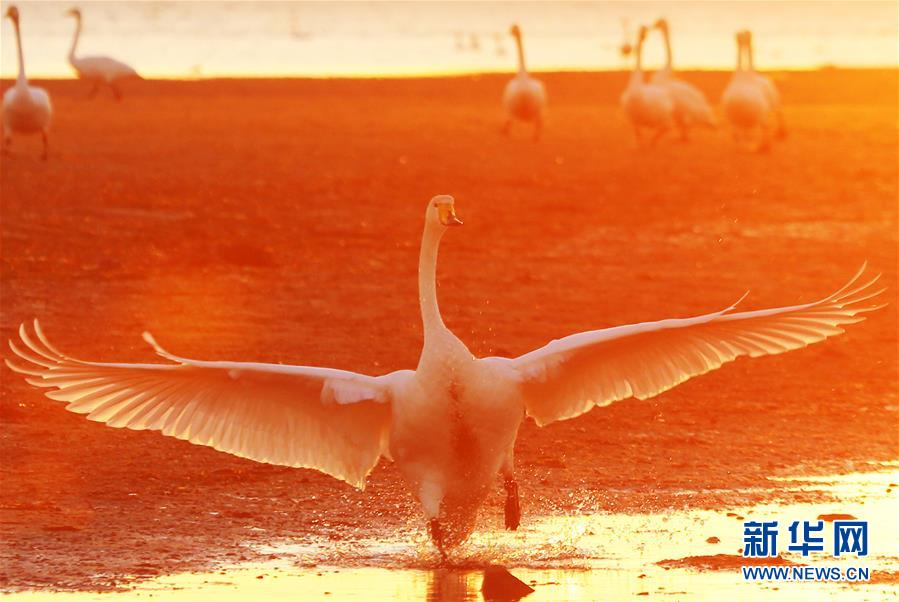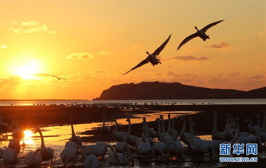 11月9日清晨,大天鹅在荣成天鹅湖飞翔、休憩。目前,来到山东荣成大天鹅国家级自然保护区越冬的大天鹅已达4200余只。 新华社发(王福东 摄)