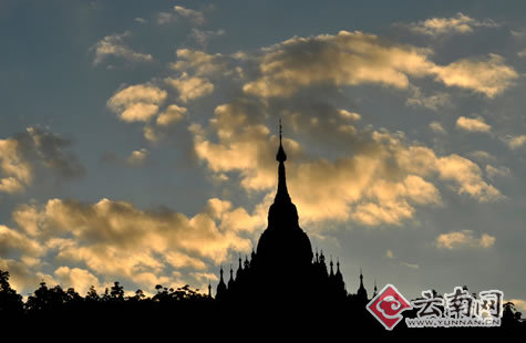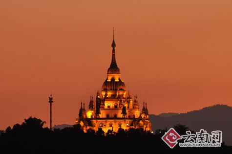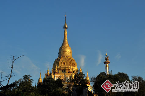 勐焕大金塔位于芒市城区东南方的雷崖让山之巅,属南亚傣王宫的建筑风格,有着深厚的民族文化内涵,堪称当今中国南传上座部佛教第一塔。塔的四周山清水秀,郁郁葱葱,环境幽雅,视野辽阔。塔高73米,底宽50米,雄伟壮观,气势恢宏。