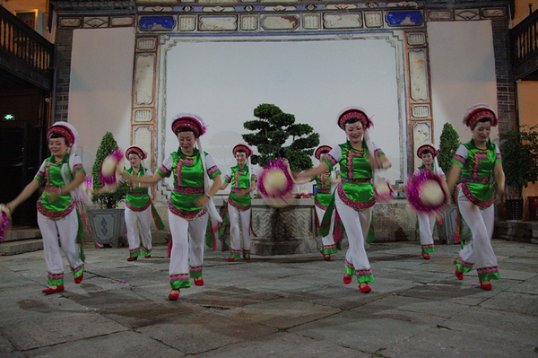 来到喜洲自然少不了观看白族的民族歌舞。白族人会在重要节庆活动上表演霸王鞭舞,白族霸王鞭充满着喜庆欢乐的气氛。霸王鞭用约一米长的空心竹或扁形木条,凿约十公分左右长的四至五个孔,每孔内装二组铜钱,每组用二至三枚。它是一种摇击奏乐器,演出时持杆,以两端随舞碰击身、膝或肘发声。