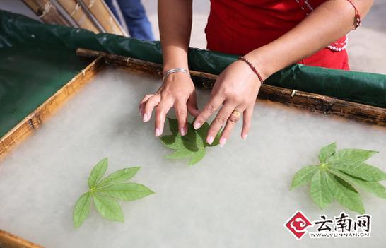 芒团是临沧孟定遮哈村的一个自然村,这里有着600多年的造纸历史,因盛产白棉纸得以闻名,有“中华傣家造纸第一村”之美誉。傣影手工艺术有限公司负责人艾影告诉记者,村里162户人家,家家户户都会造纸,其中有62户人家固定为公司提供纸张。这项古老的技法传男不传女,采料、晒料、浸泡、拌灰、蒸煮、洗涤、捣浆、浇纸、晒纸、砑光、揭纸等11道工序中,除了添加草木灰,纸张原料就是构树。