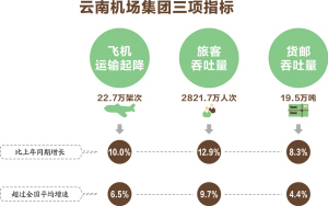 上半年以来,全省机场累计保障的飞机运输起降架次、旅客吞吐量、货邮吞吐量均超过了全国机场三项指标的平均增速6.5%、9.7%和4.4%。其中昆明机场1—6月保障飞机运输起降15.7万架次,旅客吞吐量2000.2万人次,货邮吞吐量17.8万吨,分别比上年同期增长8.2%、10.7%、8.0%,保障飞机运输起降架次在全国机场中排名第4;旅客吞吐量在全国机场中排第6位。丽江机场保障飞机运输起降2.59万架次,旅客吞吐量320.34万人次,货邮吞吐量3907.8吨,分别比上年同期增长25.9%、27.9%、13.8%。大理机场保障飞机运输架次6254架次,旅客吞吐量66.76万人次,货邮吞吐量1430.1吨,分别比上年同期增长20.9%、22.9%、19.0%。此外,普洱、保山机场运输起降架次和旅客吞吐量呈快速增长态势,西双版纳、腾冲、文山机场货邮吞吐量增势迅猛。