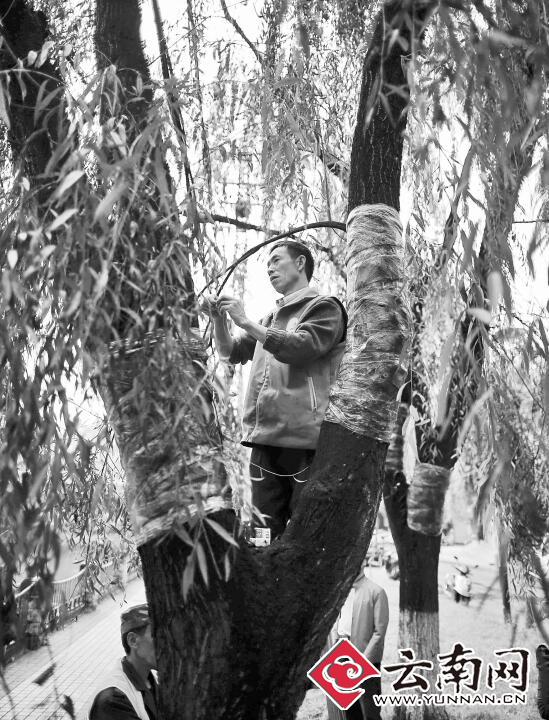 昨日上午,在盘龙江畔,几名工作人员在几棵柳树上放置了一些透明的小塑料管,这些小瓶子用胶带贴着,再用图钉钉在树干上。