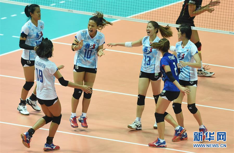 6月12日,泰国队球员在比赛中庆祝得分。当日,在2016世界女排大奖赛宁波北仑站第三比赛日中,泰国队以3比1战胜德国队。新华社记者黄宗治摄