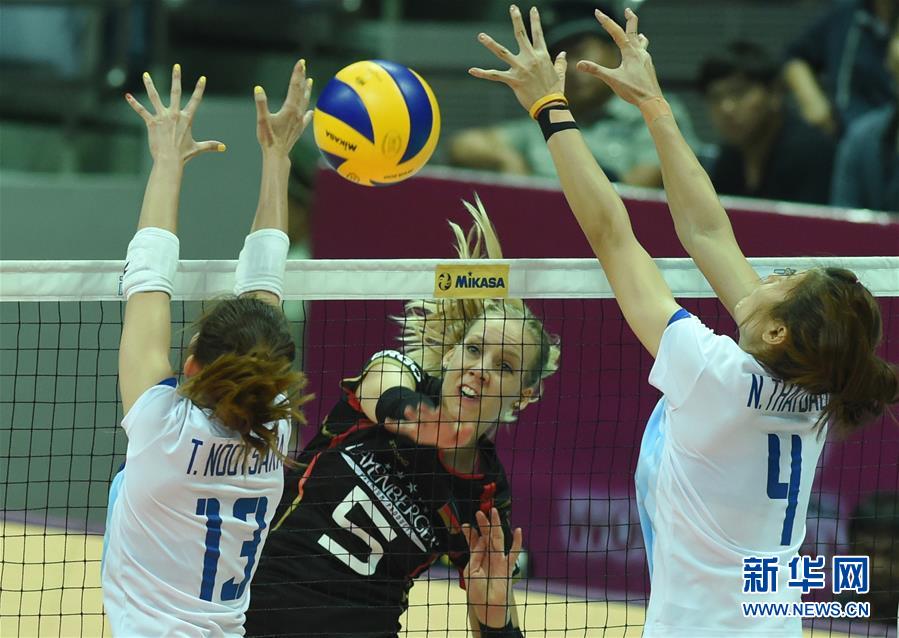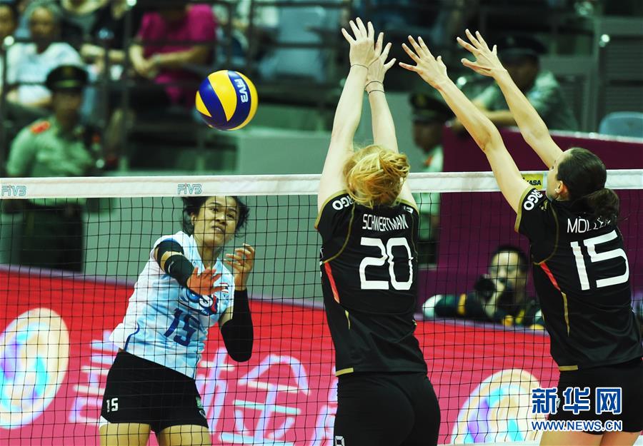 6月12日,德国队球员波尔(中)在比赛中进攻。当日,在2016世界女排大奖赛宁波北仑站第三比赛日中,泰国队以3比1战胜德国队。新华社记者黄宗治摄