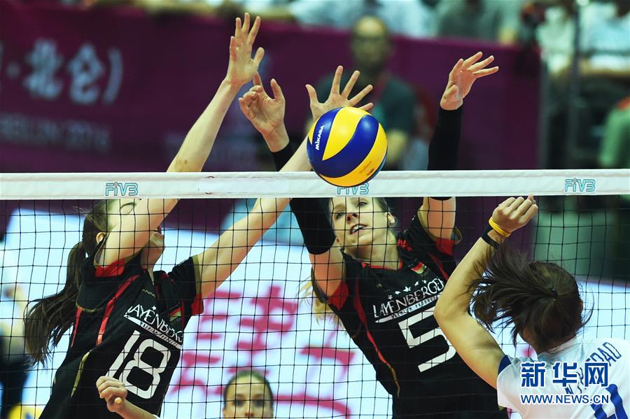 6月12日,德国队球员波尔(中)与队友在比赛中拦网。当日,在2016世界女排大奖赛宁波北仑站第三比赛日中,泰国队以3比1战胜德国队。新华社记者黄宗治摄