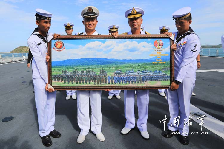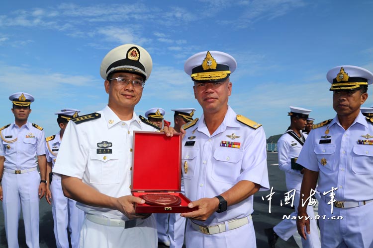 泰海军陆战师师长桑功少将向中方赠送纪念品。严家罗 摄