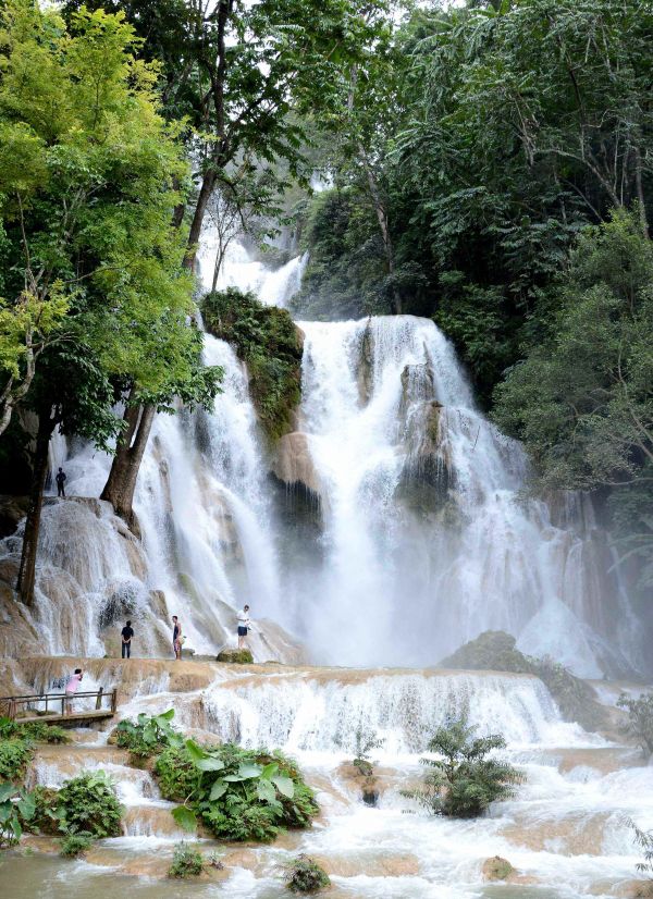 8月23日,在老挝琅勃拉邦,游客近距离观赏光西瀑布。新华社记者 荣忠霞 摄