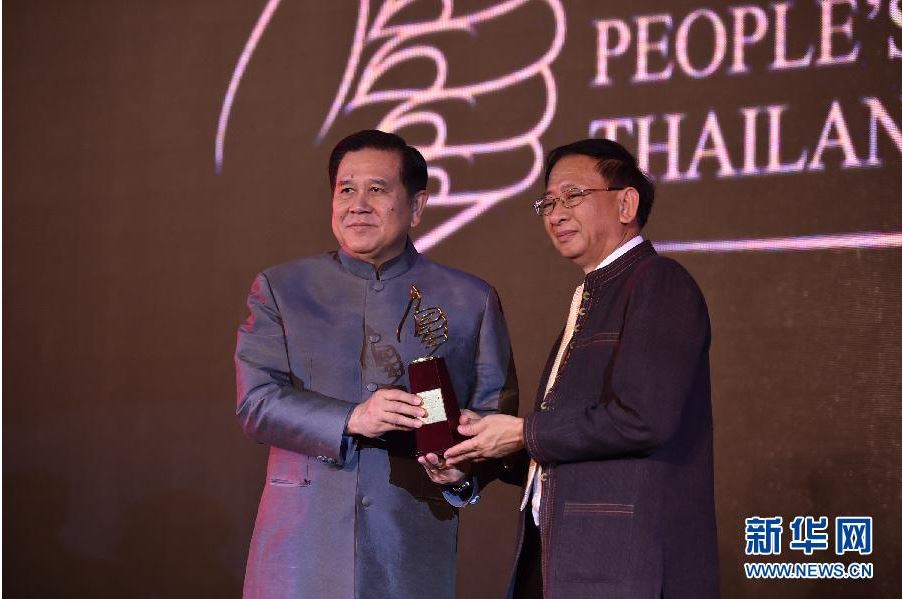 6月27日,在泰国曼谷,泰国副总理他那萨(左)在2016年度“最受中国游客欢迎奖”颁奖典礼上为清迈市代表颁发“深受中国游客喜爱旅游城市”奖杯。泰国国家旅游局27日晚在曼谷公布2016年度“最受中国游客欢迎奖”评选结果。本次评选历时两周,超过323万中国游客参与投票。他们通过特定网站,在泰国景点、酒店、餐厅、美食、购物场所、高尔夫球场、航空公司等17个类别的候选名单中选出了最喜爱的一项。泰国官员表示,希望评选能促进泰国旅游业质量不断提高,吸引更多中国游客。新华社记者李芒茫摄