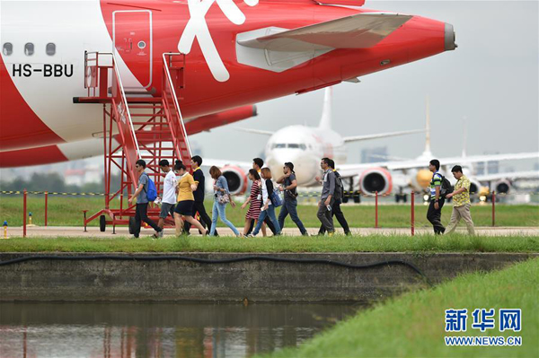 6月29日,在泰国曼谷廊曼机场举行的一场反恐搜爆演练中,“乘客”们在所乘客机解除“炸弹威胁”后重新登机。当日,为应对潜在恐怖袭击威胁,泰国首都曼谷廊曼机场举行反恐搜爆演练。在演练中,有不明身份人员打电话至廊曼机场,称一架代号为333的空中客车A-320客机内被安放了爆炸物。机场方面在接到电话后与搜爆部队合作,疏散乘客和机组人员,并对机舱和乘客行李进行爆炸物侦测,排除爆炸威胁后重新引导乘客和机组人员再次登机。新华社记者李芒茫摄