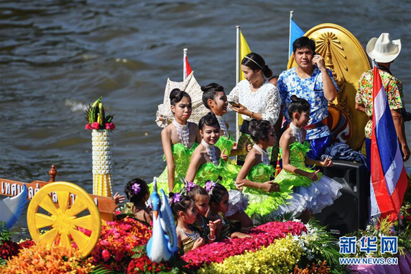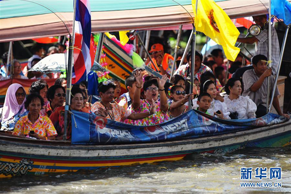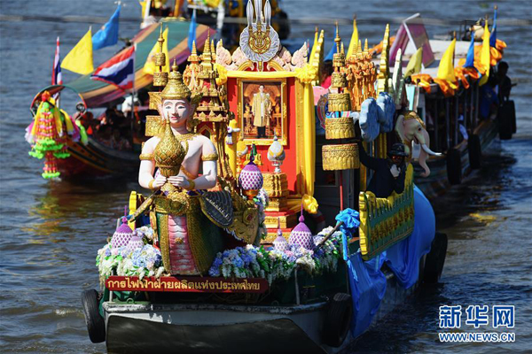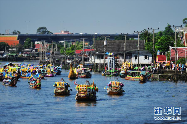7月16日,在泰国中部暖武里府的邦桂县,参加三宝佛节水上巡烛仪式的花船航行在运河水道上。当日是泰历八月十五日,为泰国重要佛教节日三宝佛节,纪念的是佛教创立者释迦牟尼修行成佛后的首次布道。巡烛是三宝佛节庆祝仪式之一,人们用装饰精美的花船装载大型蜡烛进行水上巡游,最后将蜡烛赠送给附近寺院的僧人。新华社记者李芒茫摄
