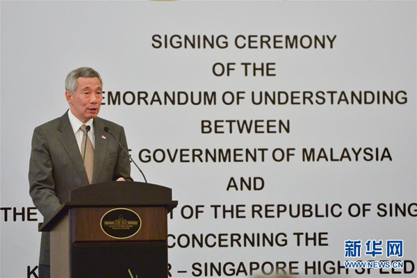 7月19日,在马来西亚普特拉贾亚,新加坡总理李显龙致辞。当日,马来西亚和新加坡政府就马新高铁项目签署谅解备忘录。两国政府领导人表示,将致力于今年内签署正式双边协议,2026年实现通车。规划中的马新高铁连接新加坡和马来西亚首都吉隆坡,全长约350公里,运行最高时速超过300公里,预计耗资超过150亿美元。新华社发(张纹综摄)