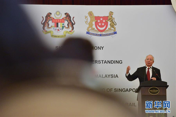 7月19日,在马来西亚普特拉贾亚,马来西亚总理纳吉布致辞。当日,马来西亚和新加坡政府就马新高铁项目签署谅解备忘录。两国政府领导人表示,将致力于今年内签署正式双边协议,2026年实现通车。规划中的马新高铁连接新加坡和马来西亚首都吉隆坡,全长约350公里,运行最高时速超过300公里,预计耗资超过150亿美元。新华社发(张纹综摄)