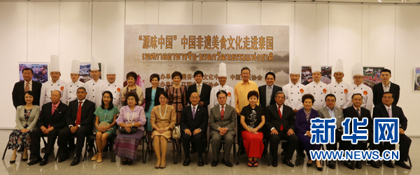 图为出席“源味中国—中国非遗美食文化周”的嘉宾与中国烹饪大师们合影。(图片由曼谷中国文化中心提供)