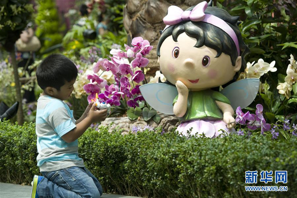 7月20日,一名儿童在新加坡滨海湾花园花穹玩耍。当日,新加坡滨海湾花园花穹举行“兰花盛会”媒体预览。“兰花盛会”花艺展将于7月22日至8月28日举行。新华社发(邓智炜摄)