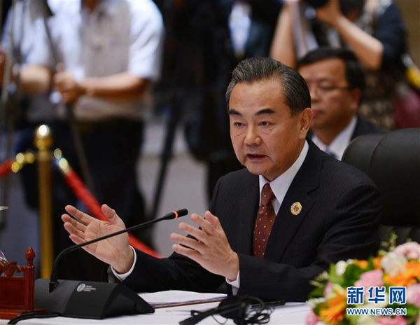 7月25日,在老挝首都万象,中国外交部长王毅出席会议。当日,中国-东盟(10+1)外长会议在老挝首都万象举行。会议结束后,中国和东盟国家外交部长发表了关于全面有效落实《南海各方行为宣言》(《宣言》)的联合声明,声明重申了《宣言》在维护地区和平稳定中发挥的重要作用,承诺根据国际法原则由直接有关国家通过磋商和谈判以和平方式解决领土和管辖权争议。新华社记者刘昀摄