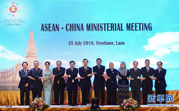 7月25日,在老挝首都万象,中国外交部长王毅(左六)和与会代表在会议开始前合影。当日,中国-东盟(10+1)外长会议在老挝首都万象举行。会议结束后,中国和东盟国家外交部长发表了关于全面有效落实《南海各方行为宣言》(《宣言》)的联合声明,声明重申了《宣言》在维护地区和平稳定中发挥的重要作用,承诺根据国际法原则由直接有关国家通过磋商和谈判以和平方式解决领土和管辖权争议。新华社记者刘昀摄