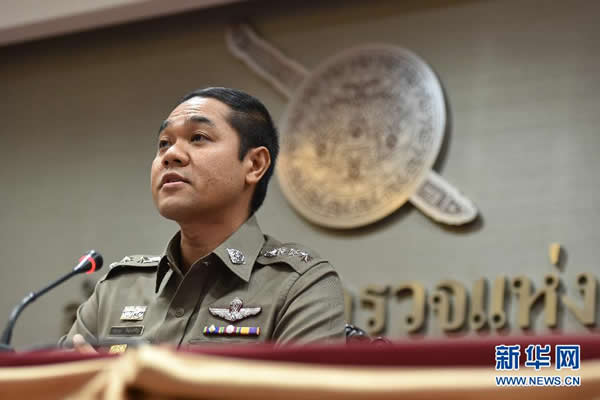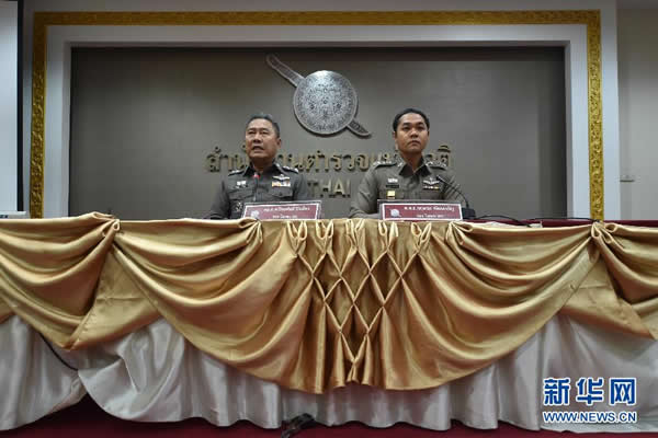 8月12日,在泰国曼谷举行的记者会上,泰国皇家警察总署副发言人批亚攀·炳蒙(左)和吉萨拿·帕塔纳查隆通报泰国南部多地爆炸及火灾的调查情况。泰国南部素叻他尼府、普吉府、巴蜀府、攀牙府等地12日发生多起爆炸及火灾,其中包括一些热门旅游地点,目前已造成1人死亡、多人受伤。