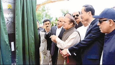 8月13日,巴基斯坦M4高速公路项目在巴东部旁遮普省绍尔果德地区举行开工仪式,这标志着亚投行在巴基斯坦投资的首个公路项目正式破土动工。图为巴基斯坦总理谢里夫(右三)、中国驻巴基斯坦大使孙卫东(右二)等为项目开工揭牌。