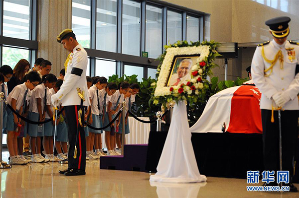 8月25日,人们在新加坡前总统纳丹的灵柩前哀悼。新加坡前总统纳丹的遗体于8月25日至26日中午停放在国会大厦,供民众瞻仰。 新华社发(邓智炜摄)