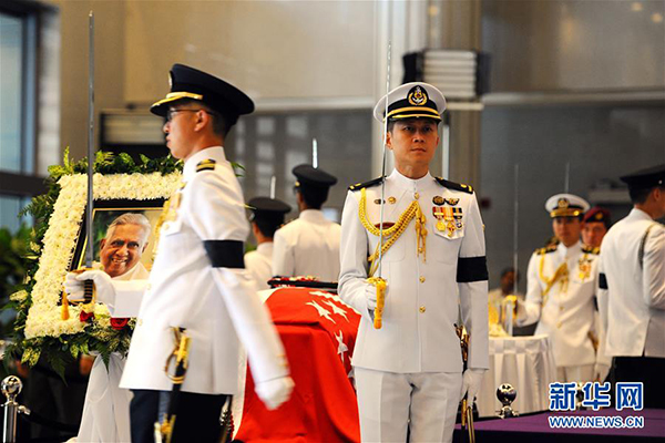 8月25日,护柩军官在新加坡前总统纳丹的灵柩旁值勤。新加坡前总统纳丹的遗体于8月25日至26日中午停放在国会大厦,供民众瞻仰。 新华社发(邓智炜摄)