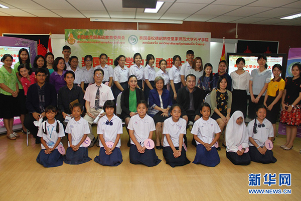 8月31日,2016年泰国中小学汉语既能大赛落幕。图为小学生、中学生选手与嘉宾和评委合影。(图片由曼松德昭帕亚皇家师范大学孔子学院提供)