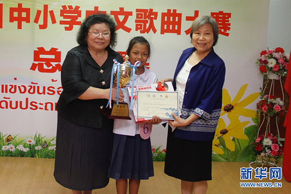 8月31日,2016年泰国中小学汉语既能大赛落幕。图为吴泰湾特别顾问鼓励小选手取得好成绩。(图片由曼松德昭帕亚皇家师范大学孔子学院提供)