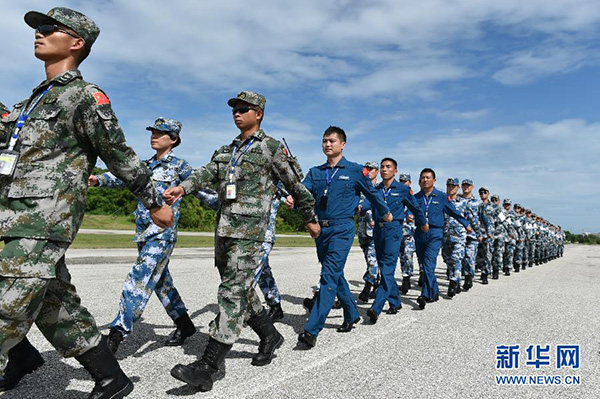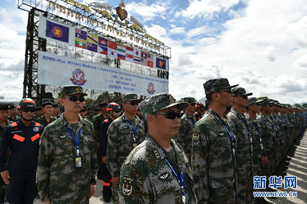 9月5日,在泰国春武里府,中国陆军工兵分队参加第二次东盟防长扩大会人道主义援助救灾与军事医学联合演练开幕式。第二次东盟防长扩大会人道主义援助救灾与军事医学联合演练5日在泰国曼谷、春武里府及其附近海域拉开帷幕。中国、俄罗斯、美国、东盟国家等东盟防长扩大会18个成员国军队1200余人及多艘舰船和多架飞机参演。新华社记者 李芒茫 摄