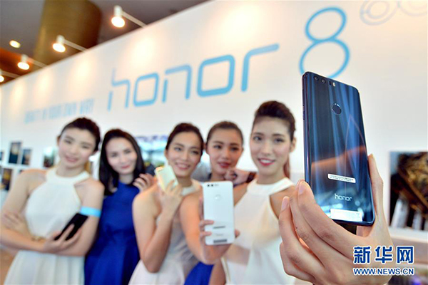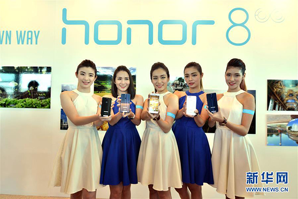 9月6日,在马来西亚吉隆坡,模特在推介仪式上展示华为智能手机荣耀8。中国最大的智能手机生产商华为公司6日在吉隆坡为该公司最新智能手机产品荣耀8举行了发布仪式,备受瞩目的荣耀8智能机正式进入马来西亚市场。新华社发(张纹综摄)