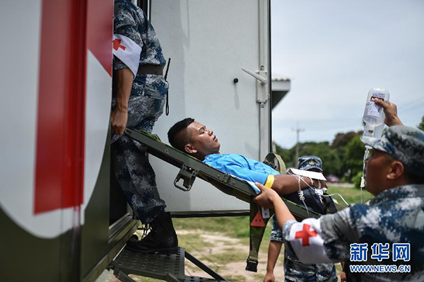 9月8日,在泰国中部春武里府,中国人民解放军空军医疗分队官兵在联合演练中模拟救治伤员。 9月6日起,第二次东盟防长扩大会人道主义援助救灾与军事医学联合演练全面展开。我军工兵、医疗、陆航、海上等分队全面组织实施各个演练课目,向世界军事同行展示了过硬技术和优良作风。新华社记者李芒茫摄