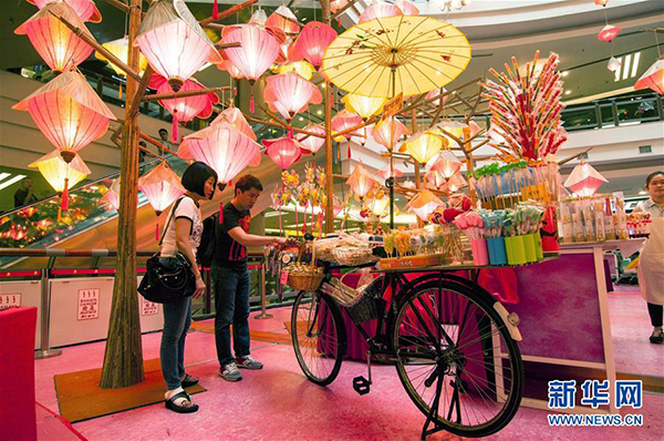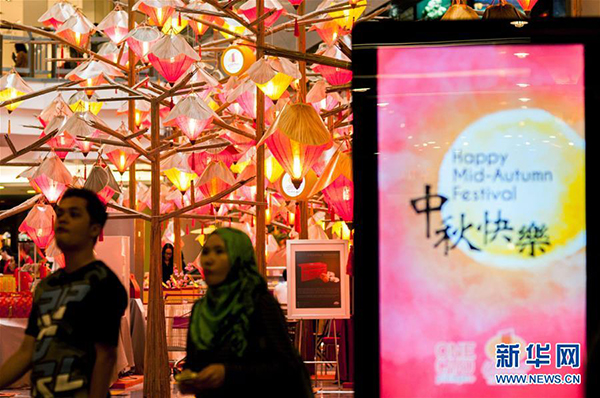 9月9日,在马来西亚首都吉隆坡,顾客在一家商场选购食品。中秋节临近,吉隆坡的一家大型商场挂起灯笼装饰。 新华社发(张纹综摄)