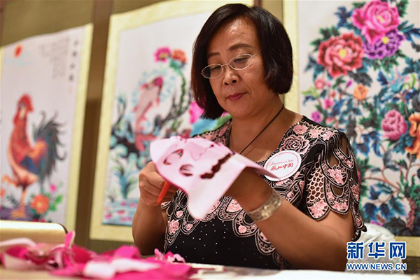 9月23日,在泰国曼谷诗丽吉皇后国家会展中心,来自中国河北蔚县的剪纸艺术家周淑英在活动中展示剪纸技艺。 “感知中国·泰国行”系列活动23日在曼谷拉开帷幕。此次活动由中国国务院新闻办公室、中国驻泰国大使馆、泰中友好协会等联合主办。新华社记者李芒茫摄