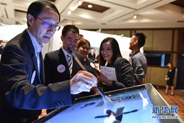 9月23日,在泰国曼谷诗丽吉皇后国家会展中心,一位泰国嘉宾在活动中使用触摸互动屏幕体验中国毛笔书法。 “感知中国·泰国行”系列活动23日在曼谷拉开帷幕。此次活动由中国国务院新闻办公室、中国驻泰国大使馆、泰中友好协会等联合主办。新华社记者李芒茫摄