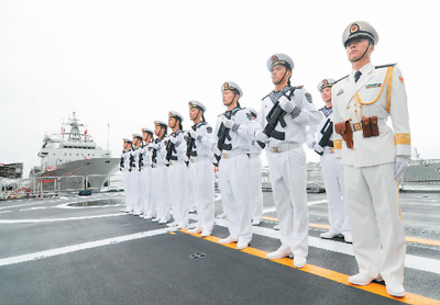 10月7日,刚刚完成亚丁湾护航任务的中国海军第二十三批护航编队抵达马来西亚巴生港,开始对马来西亚进行为期5天的友好访问。图为海军官兵在岸边列队。