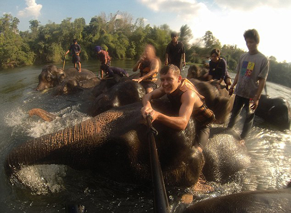 21岁的克莱顿·克鲁斯(Clayton Kruse)来自美国加利福尼亚州,现在正值暑假,他与家人来到泰国游玩。桂亚河象背之旅历时两小时,而克莱顿在旅程开始5分钟之后便迎来旅途的“小惊喜”。