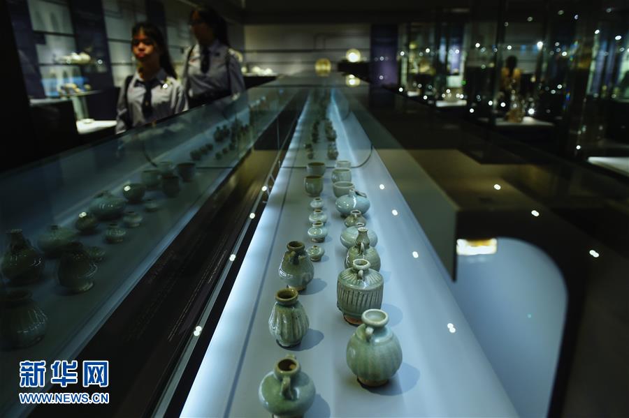 这是11月18日在泰国曼谷大学东南亚陶瓷博物馆拍摄的各式宋加洛青瓷器皿。新华社记者李芒茫摄