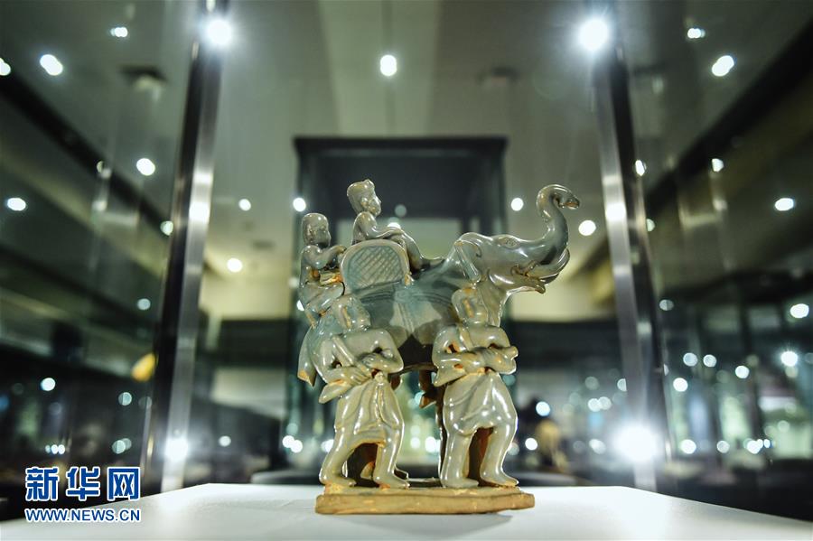 这是11月18日在泰国曼谷大学东南亚陶瓷博物馆拍摄的一尊宋加洛青瓷骑象俑。新华社记者李芒茫摄