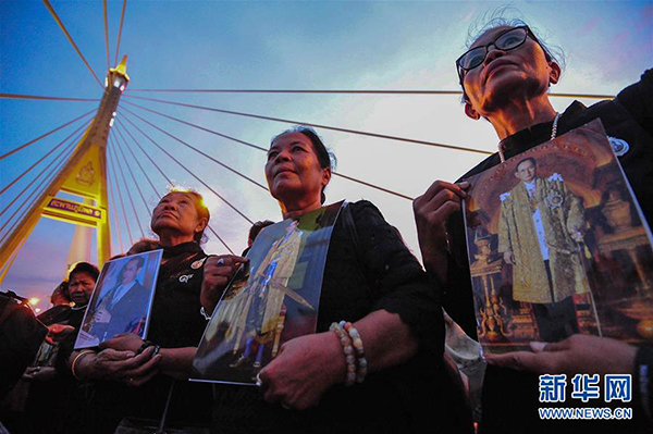 12月5日,在泰国曼谷普密蓬大桥上,民众手持已故国王普密蓬的照片。当日是泰国已故国王普密蓬·阿杜德的89岁诞辰日。约两万人参加了泰国政府在曼谷普密蓬大桥上举行的大型纪念法会,表达对普密蓬国王的追思。新华网发(拉亨摄)