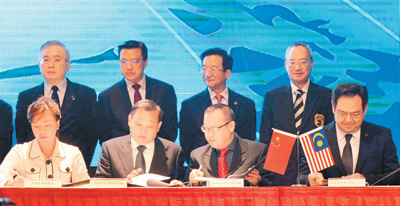 图为马来西亚华人公会总会长、马交通部长廖中莱(后排左二)与中国驻马来西亚大使黄惠康(后排右二)见证中马双方签约仪式。