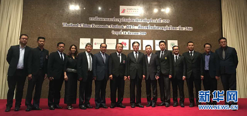 “2017年泰中经济展望”研讨会12月14日在曼谷举行,中国驻泰国大使宁赋魁(左八)、泰中记者协会会长差瓦(左七)、泰国中国企业总商会会长张雷(左六)等与会。新华网发(尤东婕摄)