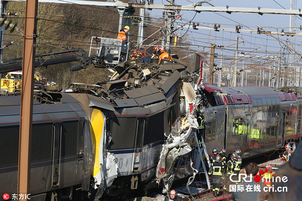 当地时间2017年2月14日,卢森堡南部迪德朗热(Dudelange),当地一列客运列车和一列货运列车发生碰撞事故,导致线路运行中断、一死多伤。图片来源:东方IC