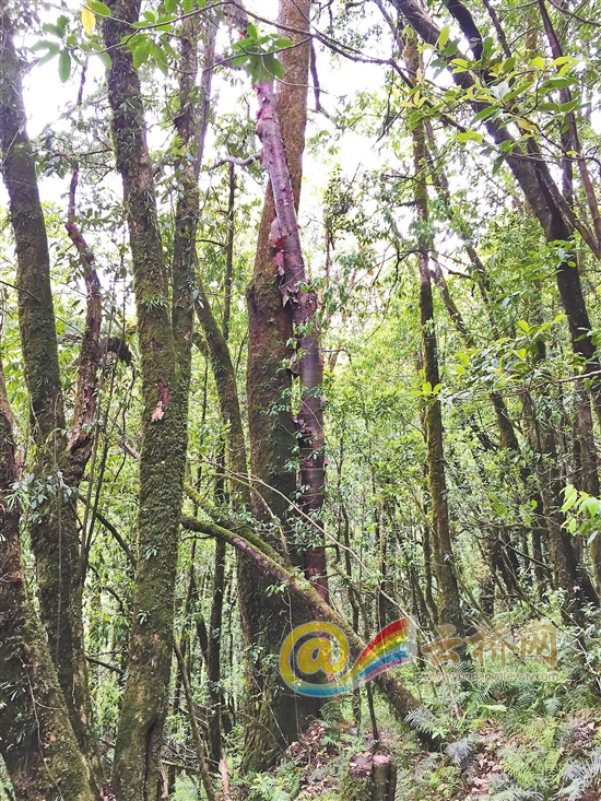 带着好奇,我们往高黎贡山的腹地前进,没走多远,被一片鲜花吸引。远远望去,翠绿色的叶片间,点缀着洁白的花,煞是好看。走近一瞧,白色的花片间还包围着黄色的小花,很是特别。“这种植物叫玉叶金花,外面白色的4片看起来像花瓣,其实不是花瓣,而是瓣化的萼片,被称为玉叶;它中间很小的花是黄色的,被称为金花。”李正波说。