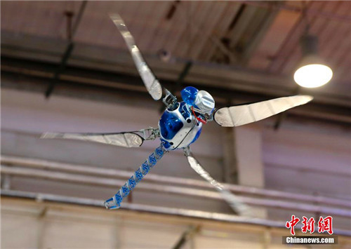 8月23日,2017世界机器人大会在北京亦创国际会展中心开幕,在展厅内展翅飞翔的仿生蜻蜓吸引了观众的目光。中新社记者 刘关关 摄