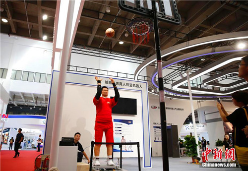 8月23日,2017世界机器人大会在北京亦创国际会展中心开幕,姚明高仿真人投篮机器人在展馆内秀球技。中新社记者 刘关关 摄
