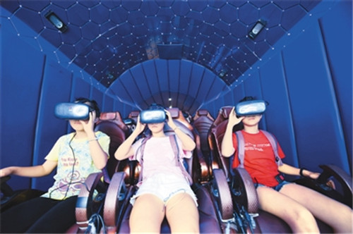 7月21日,小朋友在“天宫二号”模型里体验利用VR技术进行太空遨游。龙巍 摄(人民视觉)